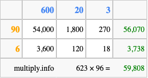 That's all there is to it! As you can see from the box above, the answer to 623 times 96 using the box method is 59,808.