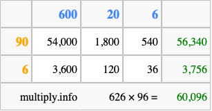 Below is an illustration showing you how to calculate 626 times 96 using the box method, using the instructions above.