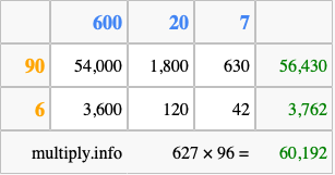 Below is an illustration showing you how to calculate 627 times 96 using the box method, using the instructions above.