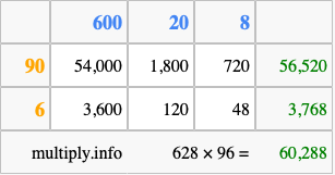 That's all there is to it! As you can see from the box above, the answer to 628 times 96 using the box method is 60,288.