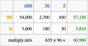 Below is an illustration showing you how to calculate 635 times 96 using the box method, using the instructions above.