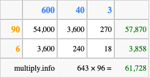 That's all there is to it! As you can see from the box above, the answer to 643 times 96 using the box method is 61,728.