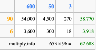 Below is an illustration showing you how to calculate 653 times 96 using the box method, using the instructions above.
