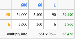 Below is an illustration showing you how to calculate 661 times 96 using the box method, using the instructions above.