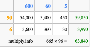 Below is an illustration showing you how to calculate 665 times 96 using the box method, using the instructions above.