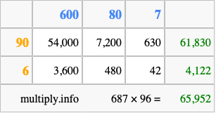 That's all there is to it! As you can see from the box above, the answer to 687 times 96 using the box method is 65,952.
