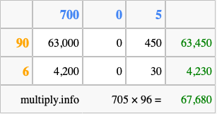 Below is an illustration showing you how to calculate 705 times 96 using the box method, using the instructions above.