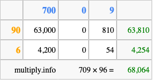 That's all there is to it! As you can see from the box above, the answer to 709 times 96 using the box method is 68,064.