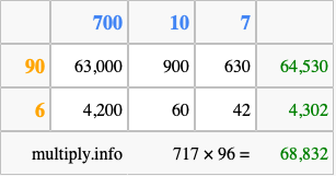 Below is an illustration showing you how to calculate 717 times 96 using the box method, using the instructions above.
