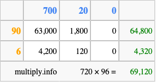 Finally, we add up all the sums we found in step 3 to get our final answer to 720 times 96.