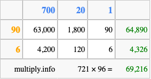 Finally, we add up all the sums we found in step 3 to get our final answer to 721 times 96.