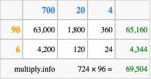 Finally, we add up all the sums we found in step 3 to get our final answer to 724 times 96.