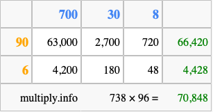 Finally, we add up all the sums we found in step 3 to get our final answer to 738 times 96.