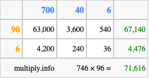 That's all there is to it! As you can see from the box above, the answer to 746 times 96 using the box method is 71,616.