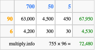 Below is an illustration showing you how to calculate 755 times 96 using the box method, using the instructions above.