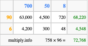That's all there is to it! As you can see from the box above, the answer to 758 times 96 using the box method is 72,768.
