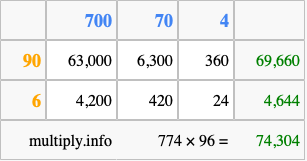 That's all there is to it! As you can see from the box above, the answer to 774 times 96 using the box method is 74,304.