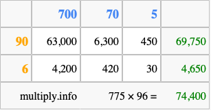 Below is an illustration showing you how to calculate 775 times 96 using the box method, using the instructions above.