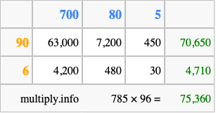 Finally, we add up all the sums we found in step 3 to get our final answer to 785 times 96.