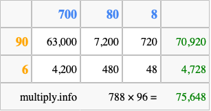 Finally, we add up all the sums we found in step 3 to get our final answer to 788 times 96.