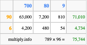 Below is an illustration showing you how to calculate 789 times 96 using the box method, using the instructions above.