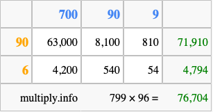 That's all there is to it! As you can see from the box above, the answer to 799 times 96 using the box method is 76,704.