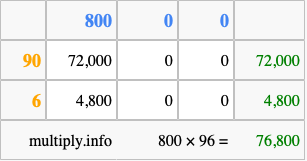 Below is an illustration showing you how to calculate 800 times 96 using the box method, using the instructions above.