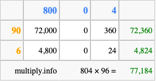 Finally, we add up all the sums we found in step 3 to get our final answer to 804 times 96.