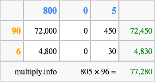 Finally, we add up all the sums we found in step 3 to get our final answer to 805 times 96.