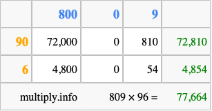 Below is an illustration showing you how to calculate 809 times 96 using the box method, using the instructions above.