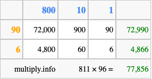 Below is an illustration showing you how to calculate 811 times 96 using the box method, using the instructions above.