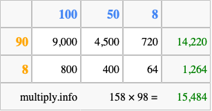 Below is an illustration showing you how to calculate 158 times 98 using the box method, using the instructions above.