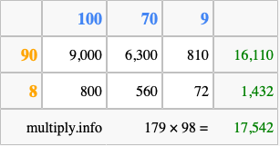 Below is an illustration showing you how to calculate 179 times 98 using the box method, using the instructions above.