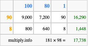 Below is an illustration showing you how to calculate 181 times 98 using the box method, using the instructions above.