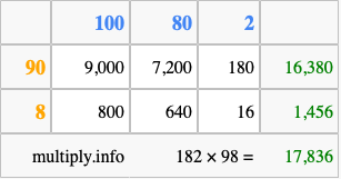 Below is an illustration showing you how to calculate 182 times 98 using the box method, using the instructions above.