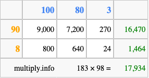 Below is an illustration showing you how to calculate 183 times 98 using the box method, using the instructions above.