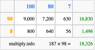 Below is an illustration showing you how to calculate 187 times 98 using the box method, using the instructions above.