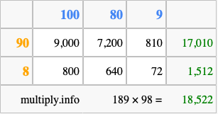 That's all there is to it! As you can see from the box above, the answer to 189 times 98 using the box method is 18,522.