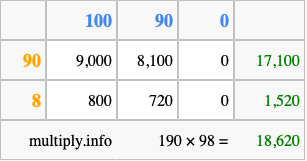 Below is an illustration showing you how to calculate 190 times 98 using the box method, using the instructions above.