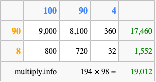 Below is an illustration showing you how to calculate 194 times 98 using the box method, using the instructions above.