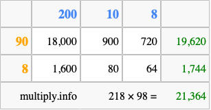 That's all there is to it! As you can see from the box above, the answer to 218 times 98 using the box method is 21,364.