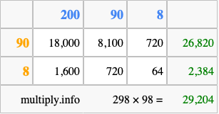 Below is an illustration showing you how to calculate 298 times 98 using the box method, using the instructions above.