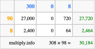 That's all there is to it! As you can see from the box above, the answer to 308 times 98 using the box method is 30,184.