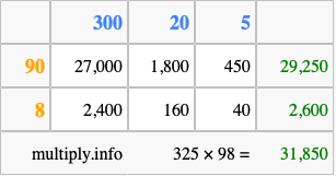 Finally, we add up all the sums we found in step 3 to get our final answer to 325 times 98.