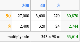 Below is an illustration showing you how to calculate 343 times 98 using the box method, using the instructions above.