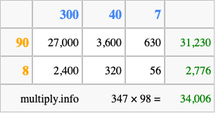 That's all there is to it! As you can see from the box above, the answer to 347 times 98 using the box method is 34,006.