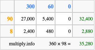 Below is an illustration showing you how to calculate 360 times 98 using the box method, using the instructions above.