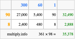 Finally, we add up all the sums we found in step 3 to get our final answer to 361 times 98.