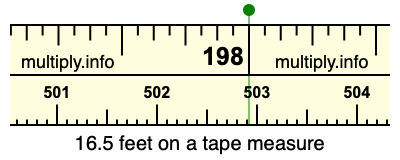 16.5 feet times 12 equals 198 inches. Therefore, 16.5 feet is at the 198 inches place on the tape measure, as displayed below.