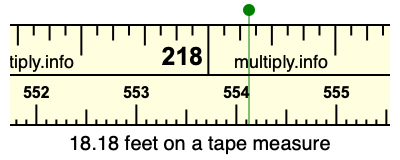 18.18 feet times 12 equals 218.16 inches. Therefore, 18.18 feet is at the 218.16 inches place on the tape measure, as displayed below.